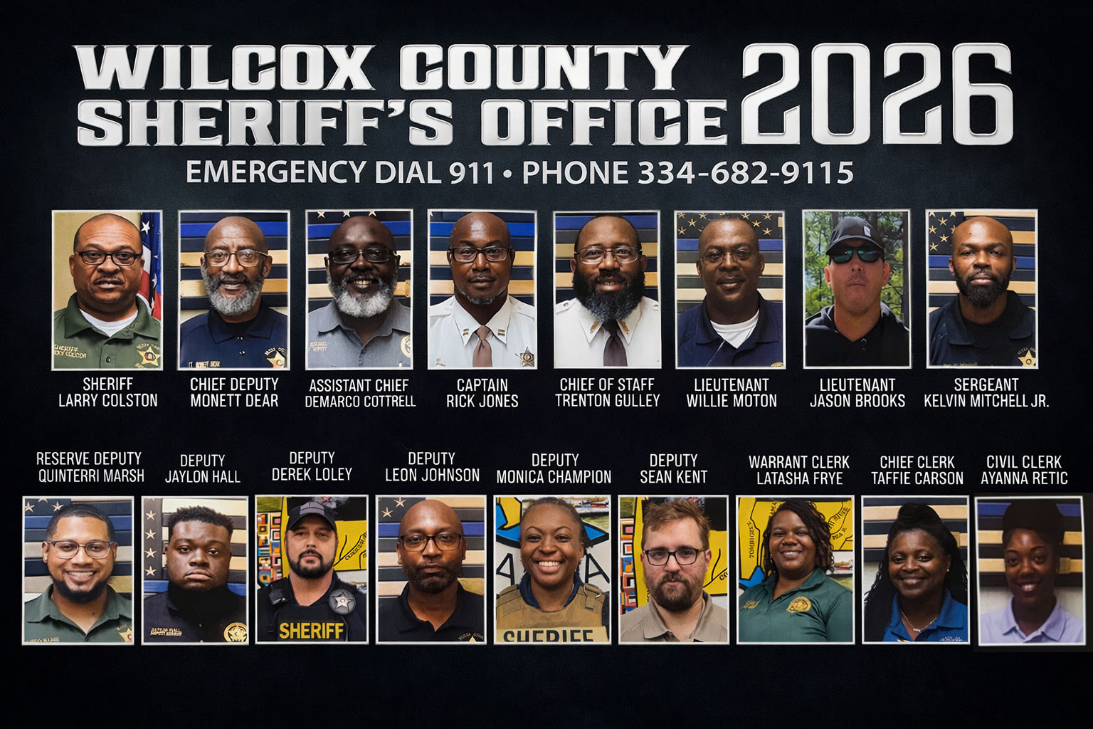 The Wilcox County Sheriff's Office is committed to serving and protecting the citizens of Wilcox County with professionalism, integrity, and respect.